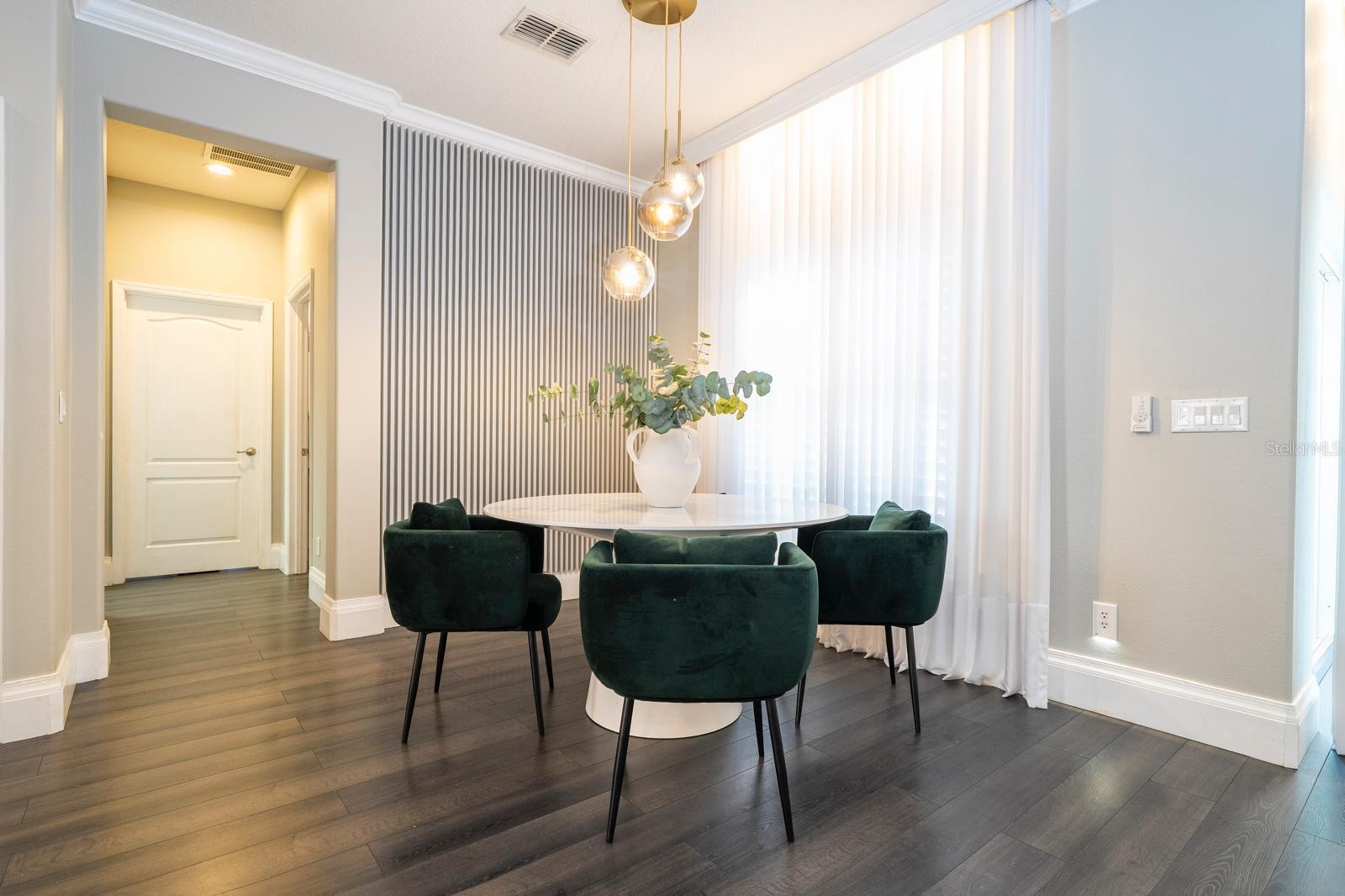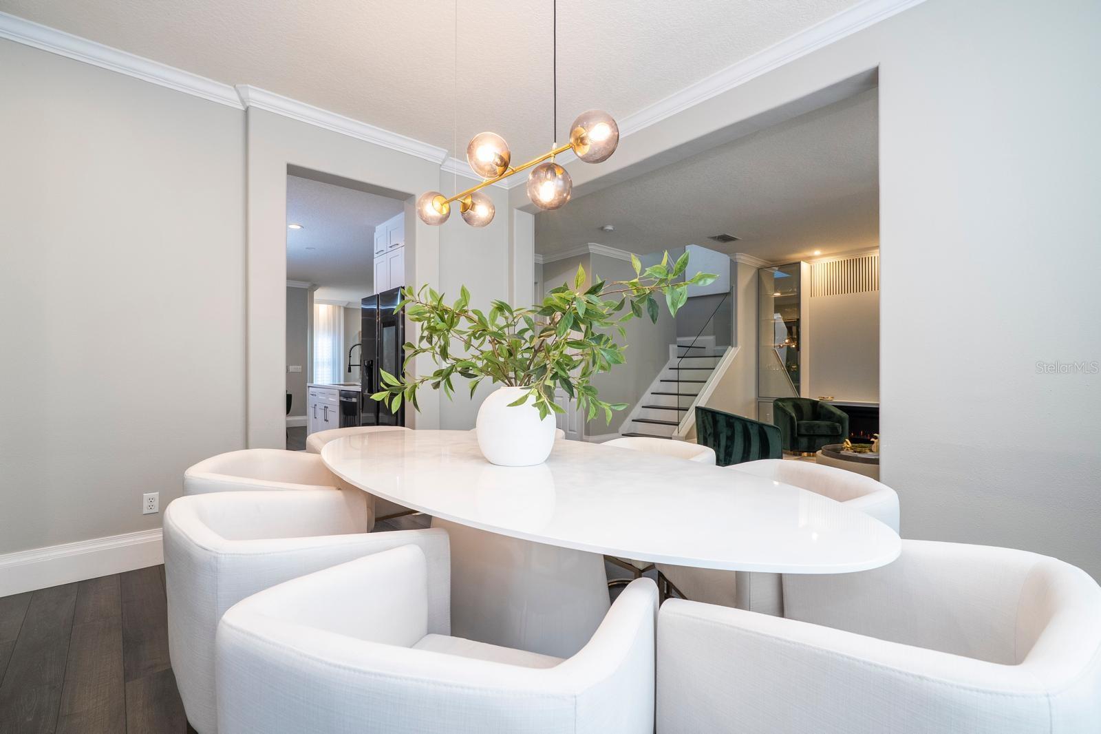 This home is equipped with custom built-in cabinetry that will remain with the sale, including the fireplace in the entry lounge, a built-in wine cellar, a custom TV panel in the living room, and decorative wall panels in the dining room.
